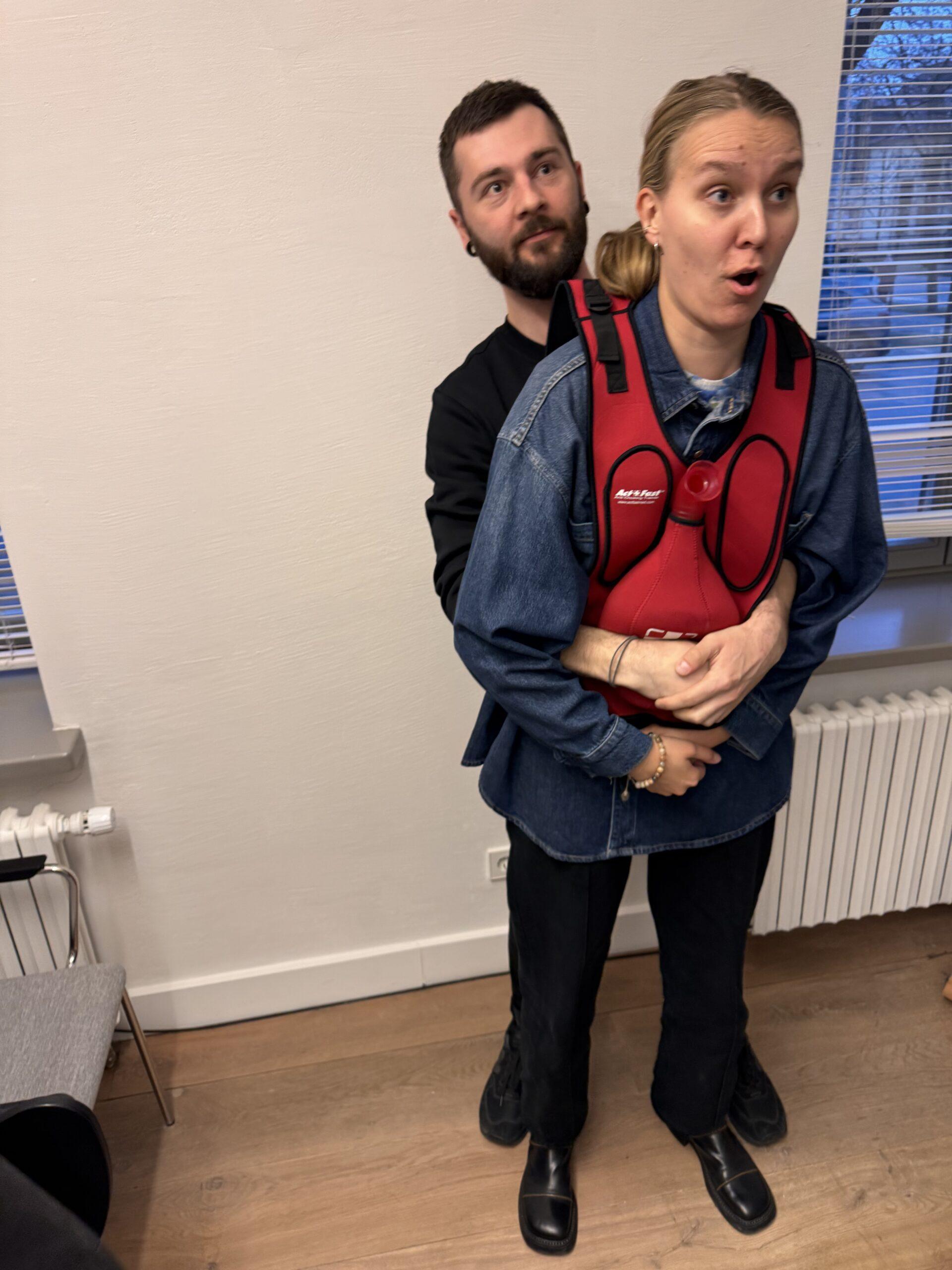 Užspringimo valdymas: Efektyvūs veiksmai (smūgiai į tarpumentę, Heimlicho manevras) užspringus kolegai ar lankytojui.